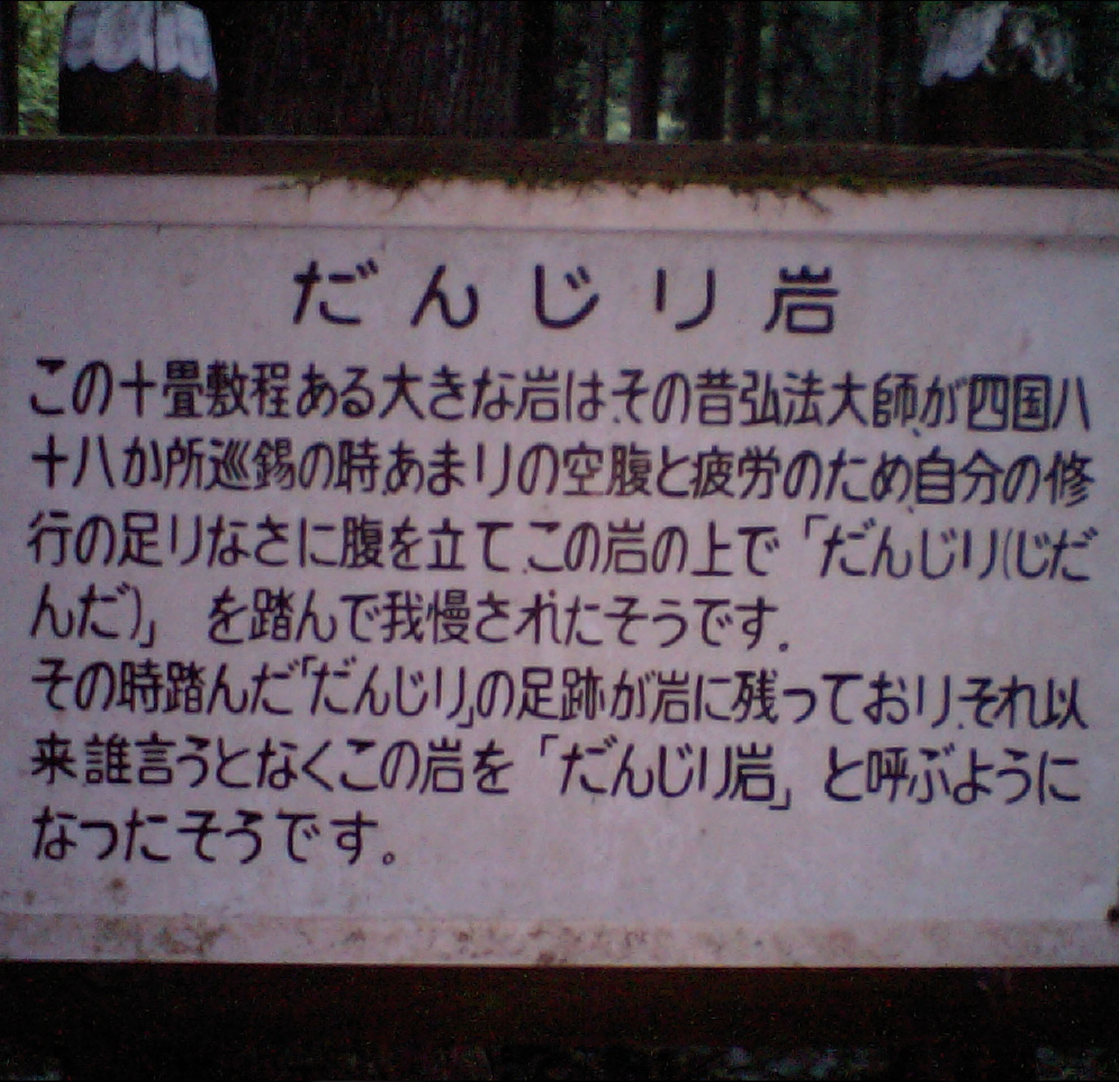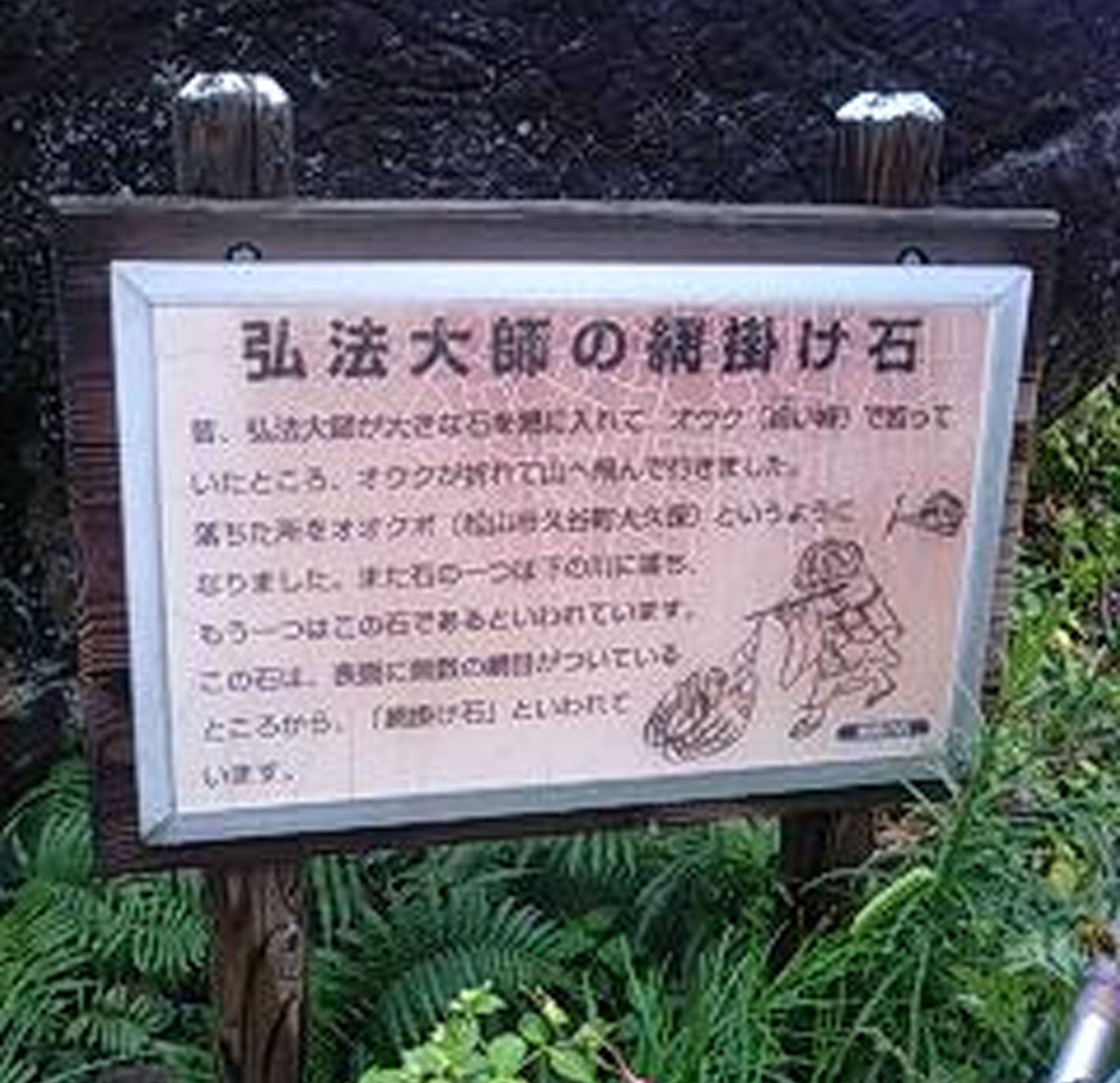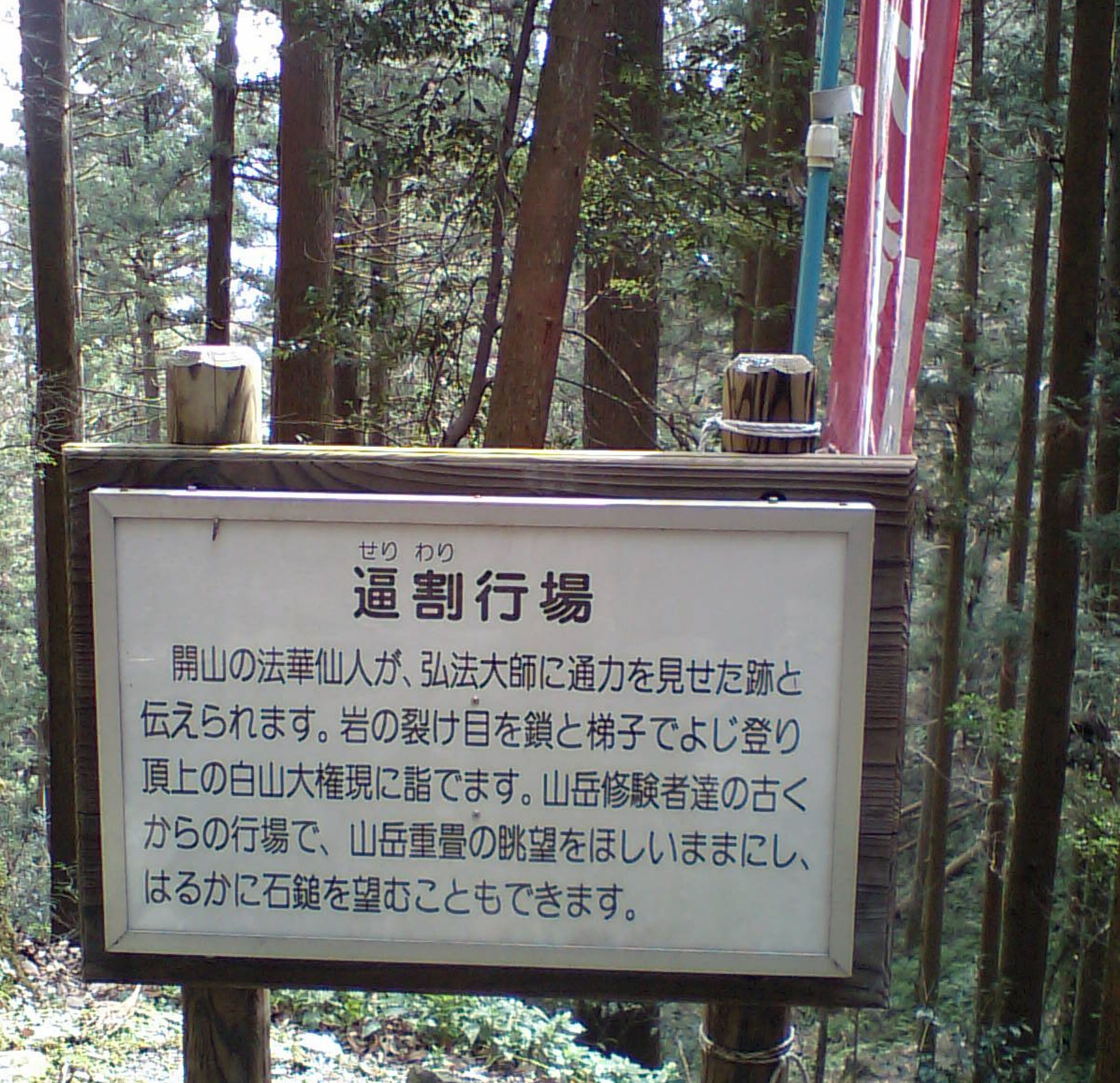 お大師様がこの地に来られた時、お大師様の力を見抜いた不思議な神通力を持つ女の法華仙人が、大師にこの地を修行の場として差し上げることにした時、己の力を見せる為に大師に、峰と峰の間から教本を中空に投げていただき、其れを仙人は宙に舞い教本を掴み帰る時、岩山を突き抜け出来たのがこの行場です。