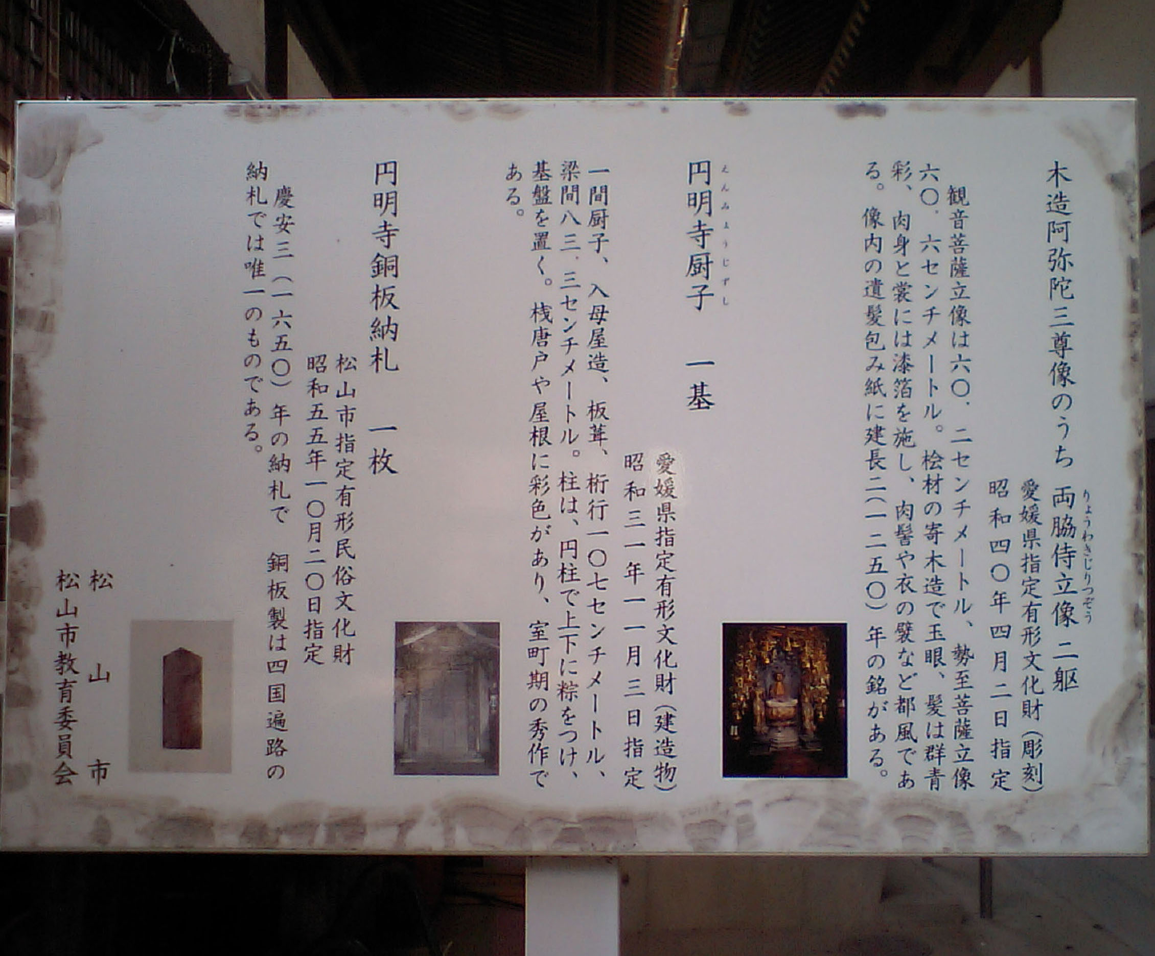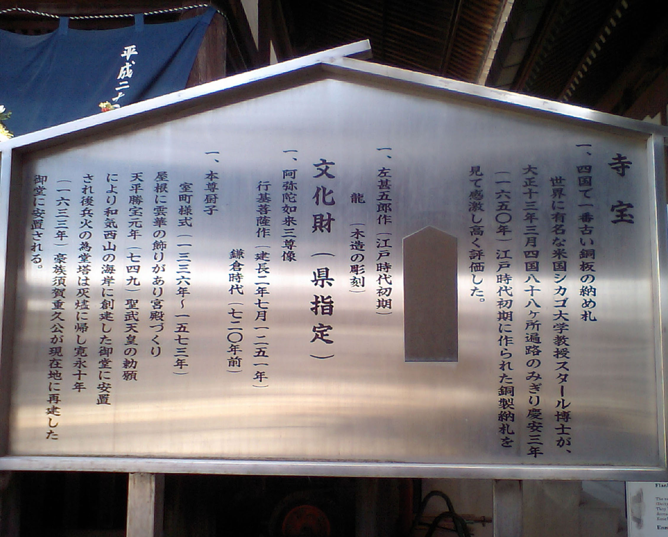 円明寺には日本最古と言われる、銅の納め札があります。江戸の初めのものだそうです。米国のスタール博士が本尊の逗子の上に打ちつけてある銅版の納め札を見つけて、高く評価した事から、広く世間に知られる様になったそうです。